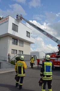 Das im Döffingen ansässige Bauunternehmen Butsch war Übungsobjekt der Jahreshauptübung der Freiwilligen Feuerwehr Grafenau. Dichter Qualm war aus der Maschinenhalle, sowie aus der Werkstatt zu sehen. Die Feuerwehr Magstadt wurde zur Unterstützung mit der Drehleiter ebenfalls in Döffinger Industriegebiet gerufen, ab sofort unterstützen wir mit unserer Drehleiter die Kameraden aus Grafenau im Ortsgebiet von Döffingen. Während sich die Kameraden aus Grafenau um die Brandbekämpfung, sowie die Menschrettung aus dem Erdgeschoss kümmerten, rettete die Drehleiterbesatzung mehrere Personen von einem Balkon und baute im Anschluss noch eine Wasserversorgung auf den Balkon auf. Das Zusammenspiel der Feuerwehren aus Magstadt und Grafenau klappte auf Anhieb reibungslos, Einsatzleiter Timo Roller aus Grafenau zeigte sich mit der Übung höchst zufrieden.