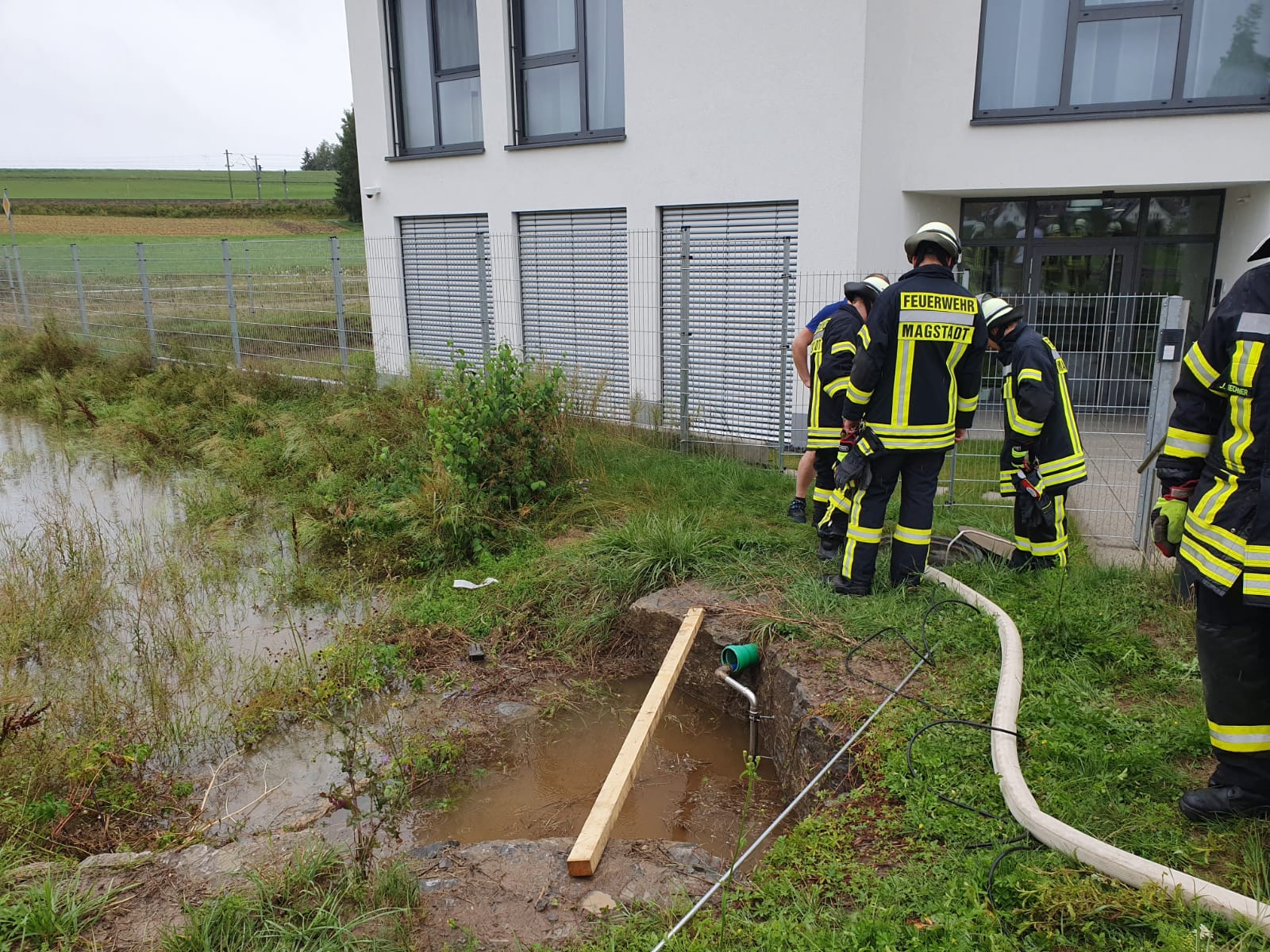 Zum zweiten Einsatz am Mittwoch wurde die Feuerwehr in die Rudolf-Diesel-Straße gerufen. Es drohte Wasser aus einem vollen Überlaufbecken in ein angrenzendes Firmengebäude einzudringen. Das Überlaufbecken konnte mit einer Tauchpumpe abgepumpt werden. Parallel konnte ein verstopftes Abwassersieb als Ursache entdeckt werden. Dieses wurde mit der Unterstützung vom Bauhof gereinigt.