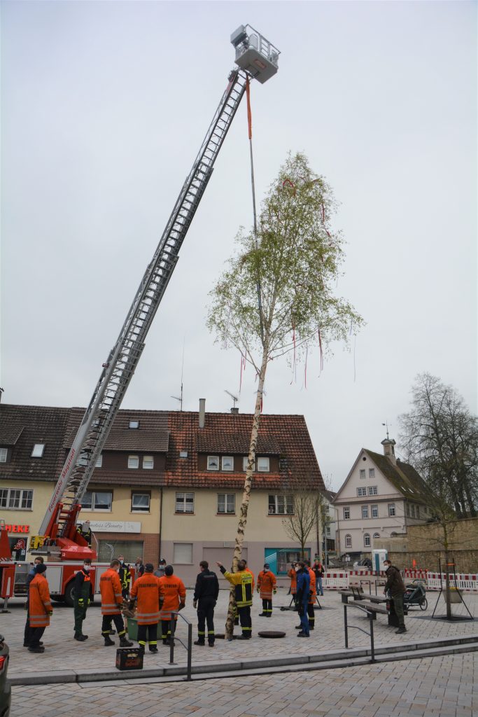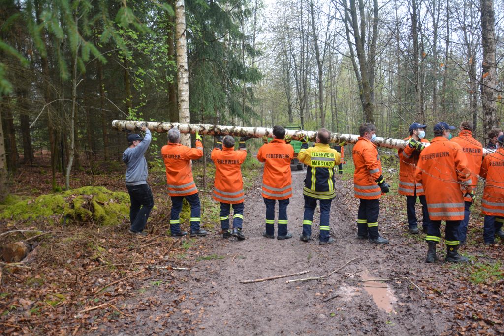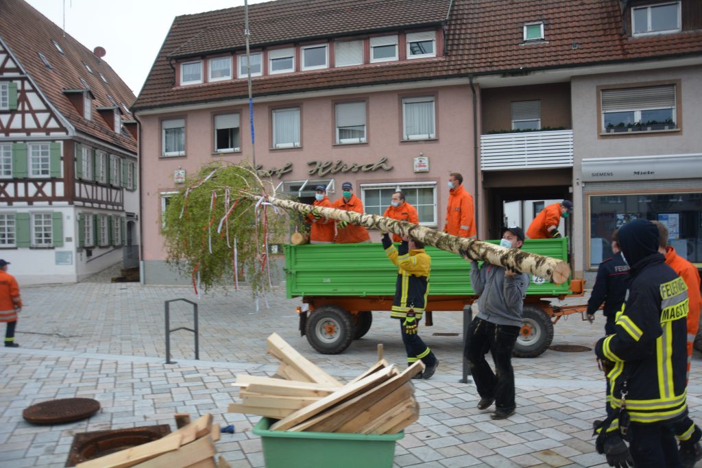 Die Feuerwehr Magstadt hat sich trotz aller Einschränkungen, die die Coronakrise mit sich bringt dazu entschieden, auch in diesem Jahr einen Maibaum aufzustellen. Mit einer deutlich kleineren Mannschaft und unter der Berücksichtigung der aktuellen Regeln wurde auch in diesem Jahr der Baum im Wald gefällt, mit Manneskraft auf einen Hänger geladen und auf dem neu gestalteten Marktplatz mit Hilfe der Drehleiter aufgestellt. Auf das traditionelle Beisammensein und die Rote Wurst unter dem Maibaum musste auch dieses Jahr verzichtet werden.