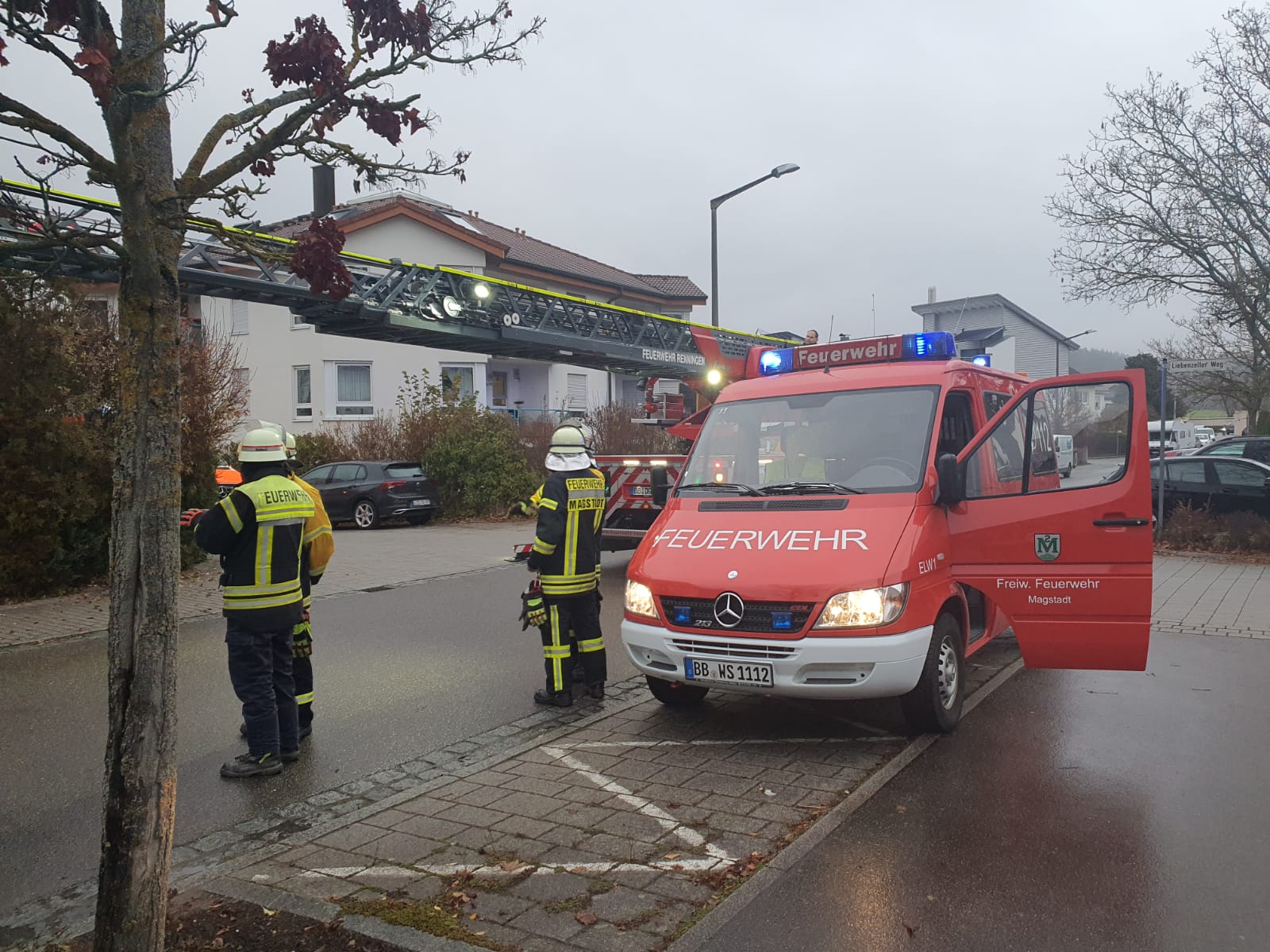 Die Feuerwehr wurde zur Unterstützung des Rettungsdienstes in den Schrambergerweg gerufen. Dort musste eine Person möglichst schonend aus einem oberen Stockwerk des Gebäudes gerettet werden. Da die Drehleiter aktuell noch bei der Reparatur ist, erhielten wir Unterstützung durch die Kameraden aus Renningen mit ihrer Drehleiter.