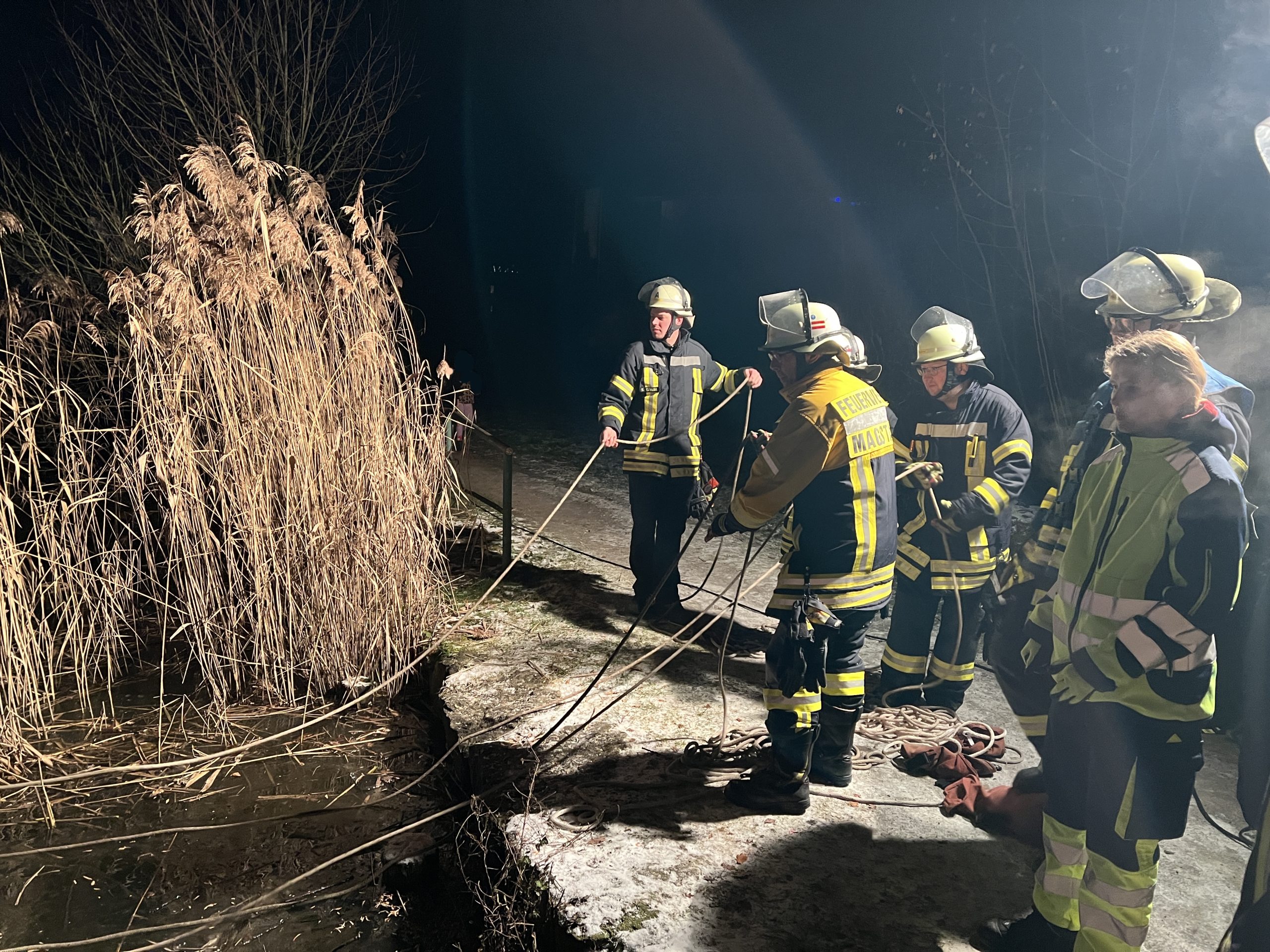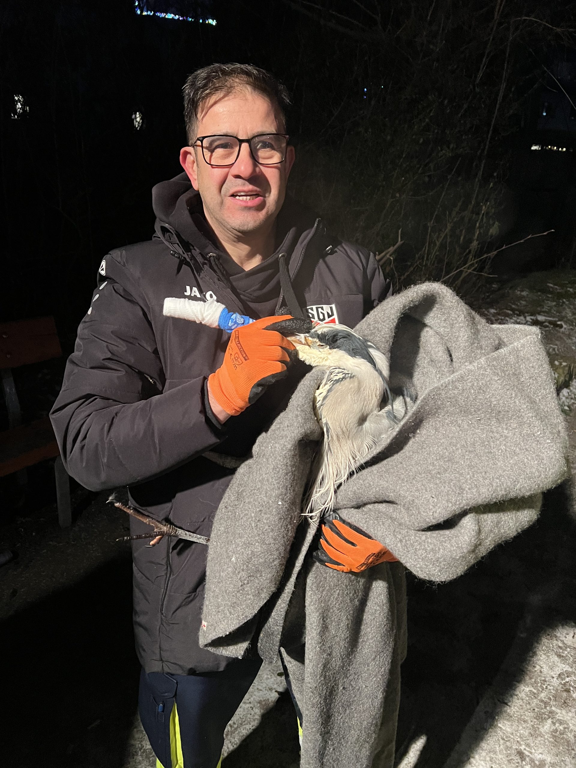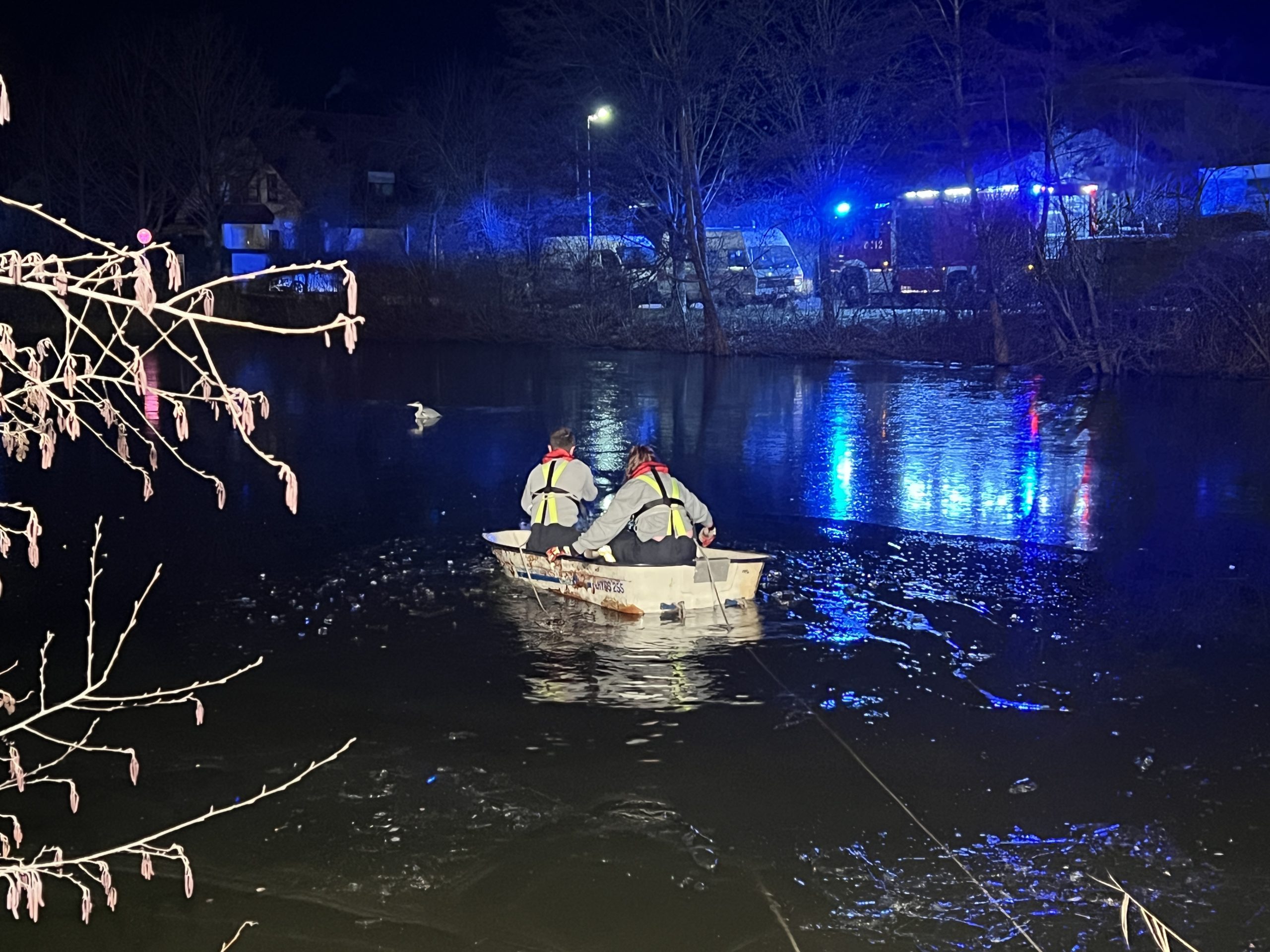 Die Feuerwehr wurde am späten Samstagnachmittag zu einer Tierrettung an den Eissee alarmiert. Vor Ort war ein Reiher in der Mitte des Sees zu sehen, der erschöpft und festgefroren war. Mit einem Boot und Äxten kämpften sich 2 Einsatzkräfte durch die mehrere Zentimeter dicke Eisschicht zu dem hilflosen Reiher. Das erschöpfte Tier ließ sich schnell einfangen und wurde in einer Decke eingehüllt ans rettende Ufer gebracht. Anschließend wurde der Reiher an die ebenfalls alarmierte „Tierrettung Schönbuch“ übergeben. Die Tierrettung versorgte den Reiher vor Ort und brachte ihn anschließend in eine Tierklinik, wo er wieder aufgepäppelt wird.